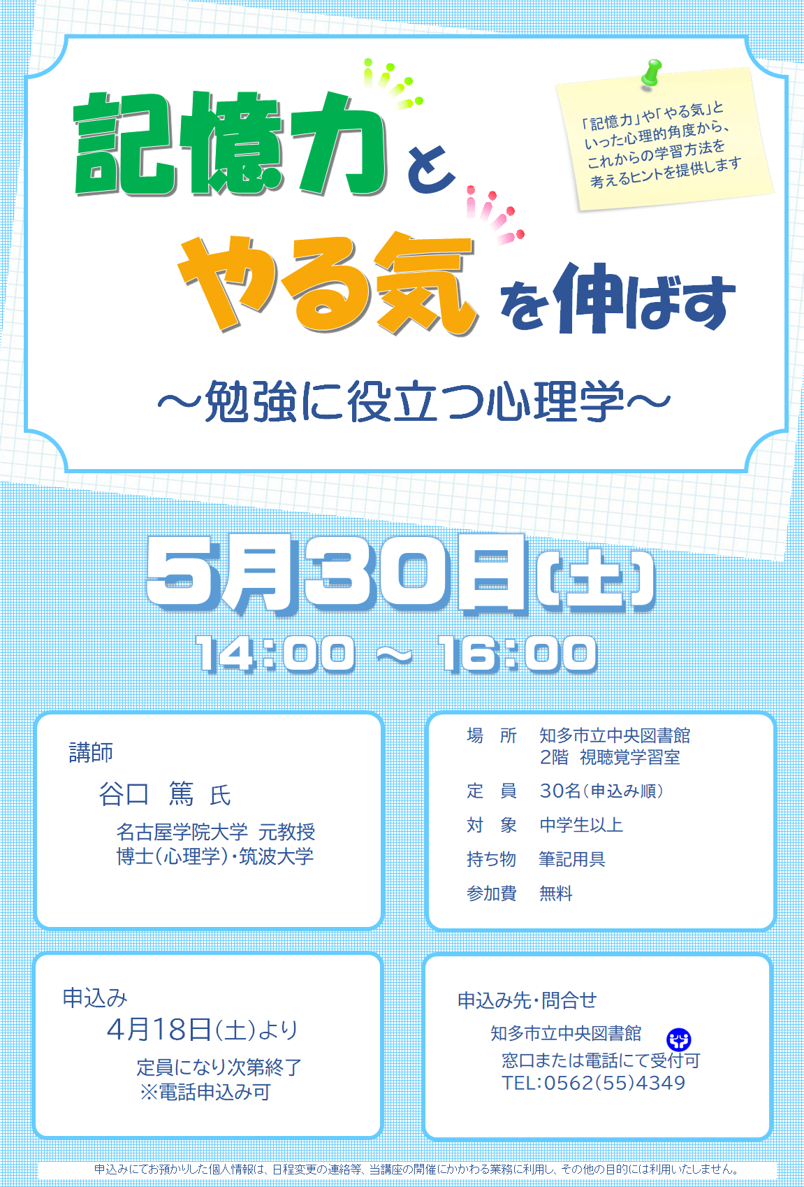 | 申込み | 4月18日(土曜日)から ※電話申し込み可 ※定員になり次第終了 ※申込みにてお預かりした個人情報は、日程変更の連絡等、 当講座の開催にかかわる業務に利用し、その他の目的には利用いたしません。 |